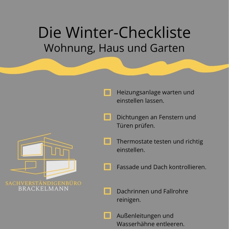 Unsere Winter-Checkliste vom Sachverständigenbüro Brackelmann in Wentorf bei Hamburg zeigt, worauf Sie jetzt achten sollten, um Ihr Zuhause sicher und energiesparend durch die kalte Jahreszeit zu bringen.